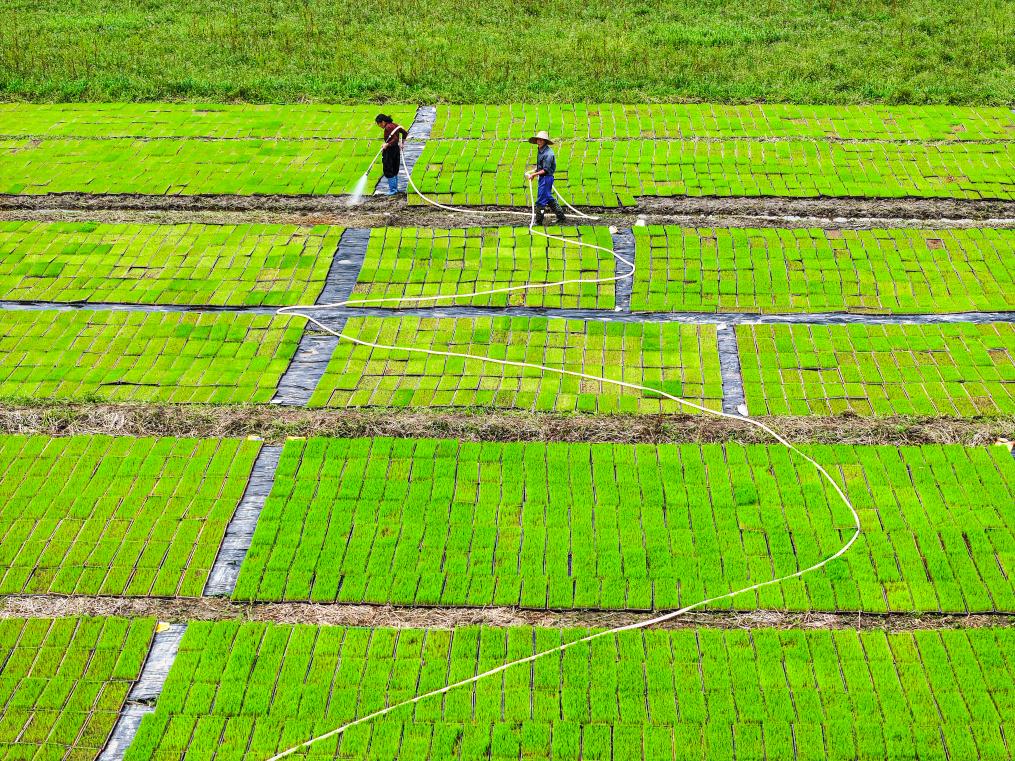 9日、湖南省常寧市で苗の管理を行う人たち。(ドローンから、常寧=新華社配信/周秀魚春)