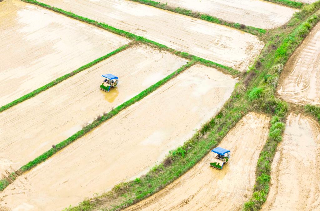 9日、田植えが始まった江西省九江市の水田。(ドローンから、九江=新華社配信/傅建斌)