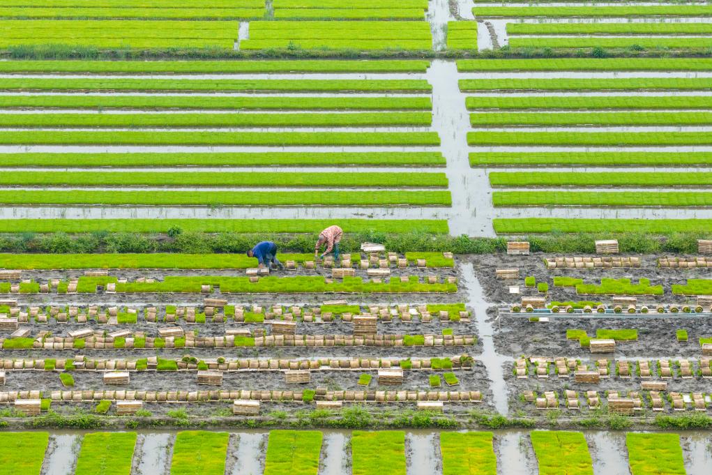 10日、浙江省余姚市で田んぼに育苗トレーを並べる人たち。(ドローンから、余姚=新華社配信/張輝)