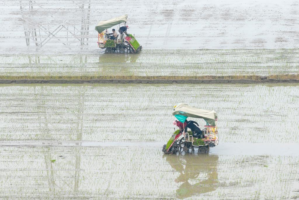 10日、浙江省余姚市で田植え機を運転する農家の人。(ドローンから、余姚=新華社配信/張輝)
