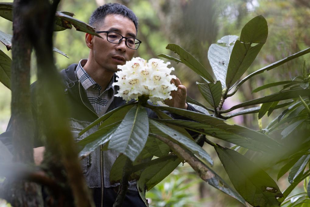 8日、華西亜高山植物園で凸尖シャクナゲの開花状態を観察する研究者。(成都=新華社記者/江宏景)