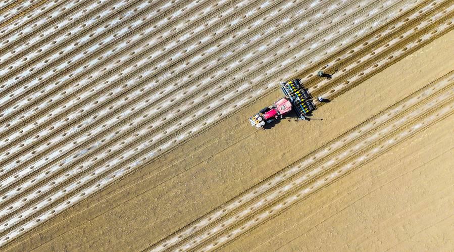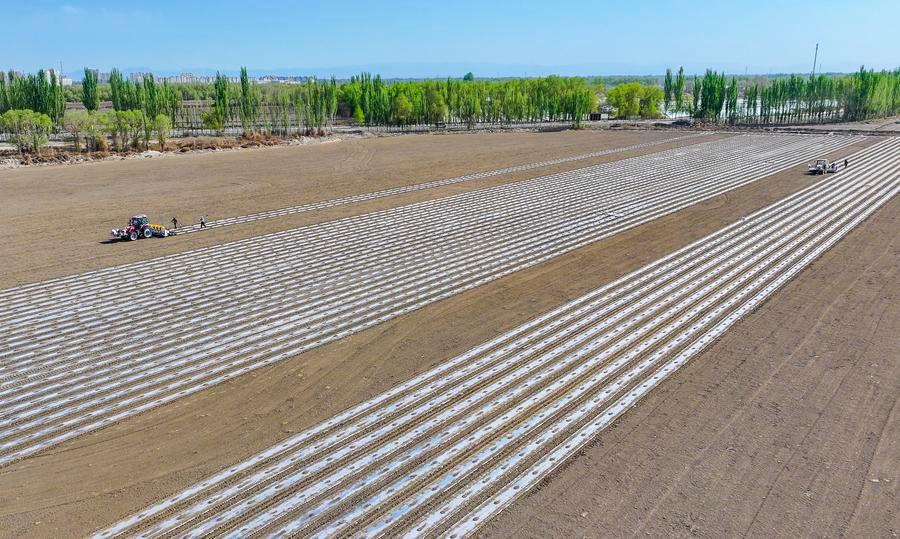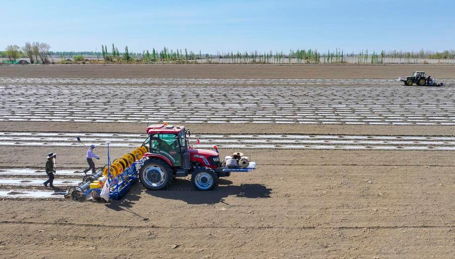 【新華社ウルムチ4月13日】中国新疆ウイグル自治区尉犁(ロプノール)県の高規格綿花畑で、作業員らが天気を見計らい手際よく種まきを進めている。同県は今年、複数の播種技術を取り入れ、100万ムー(約6万6700ヘクタール)の栽培を計画している。