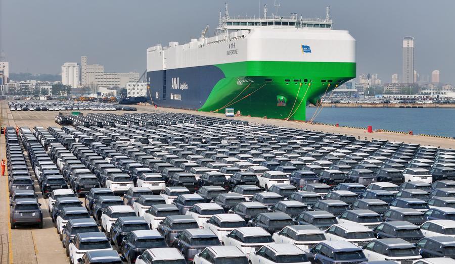 14日、山東省煙台港でロールオンロールオフ船(RORO船)への積み込みを待つ中国産自動車。(ドローンから、煙台=新華社配信/唐克)