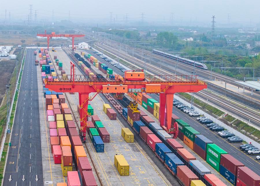 14日、南京鉄道物流センター江都物流拠点で、大型クレーンが輸出向けコンテナを鉄道・海上複合輸送列車に積み込む様子。(ドローンから、南京=新華社配信/任飛)