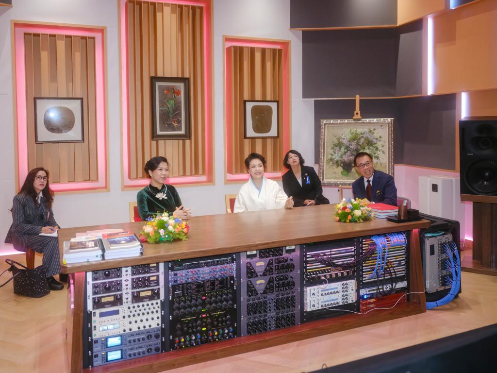 15日、中国国家大劇院で撮影に応じる彭麗媛夫人(右)とゴー・フオン・リー夫人。(北京=新華社記者/丁林)