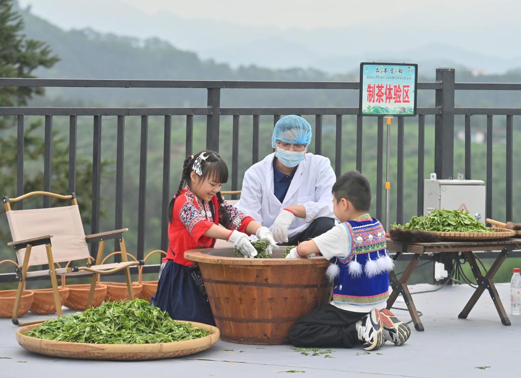 12日、広西チワン族自治区融水県の茶畑で製茶作業を体験する子ども。(柳州=新華社記者/黄孝邦)