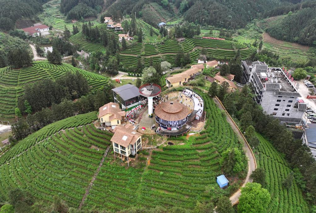 12日、春茶を楽しむイベントが開かれた広西チワン族自治区融水県の茶畑。(ドローンから、柳州=新華社配信/鄭昌昊)