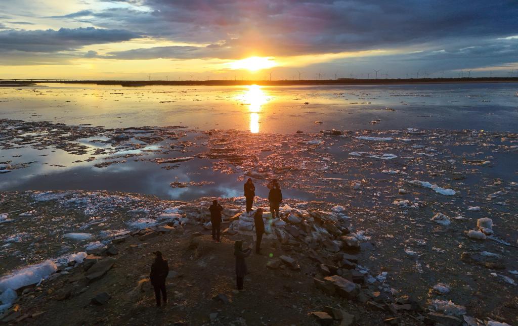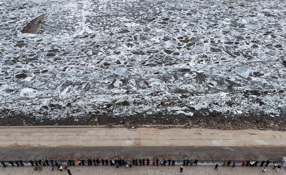 13日、黒竜江省ジャムス市を流れる松花江で流氷を見る人たち。(ハルビン=新華社配信/朱宗強)