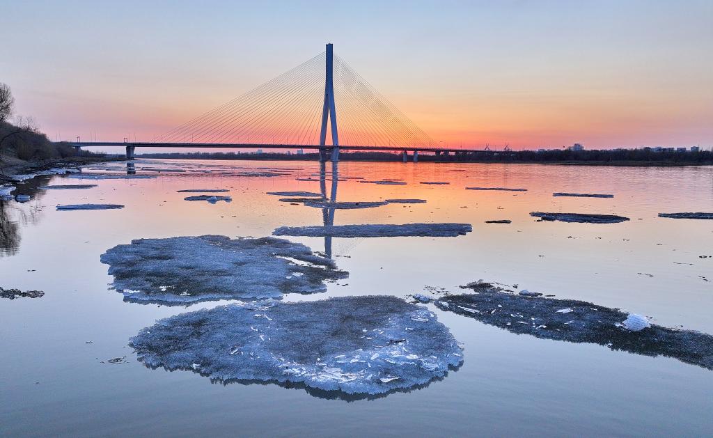 9日、黒竜江省ハルビン市を流れる松花江で観測された流氷。(ドローンから、ハルビン=新華社配信/張樹)