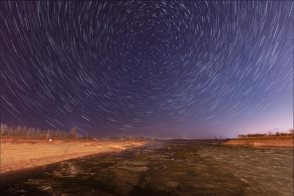 14日、黒竜江省ジャムス市を流れる松花江と星空。(比較明合成写真、ハルビン=新華社配信/劉大鵬)