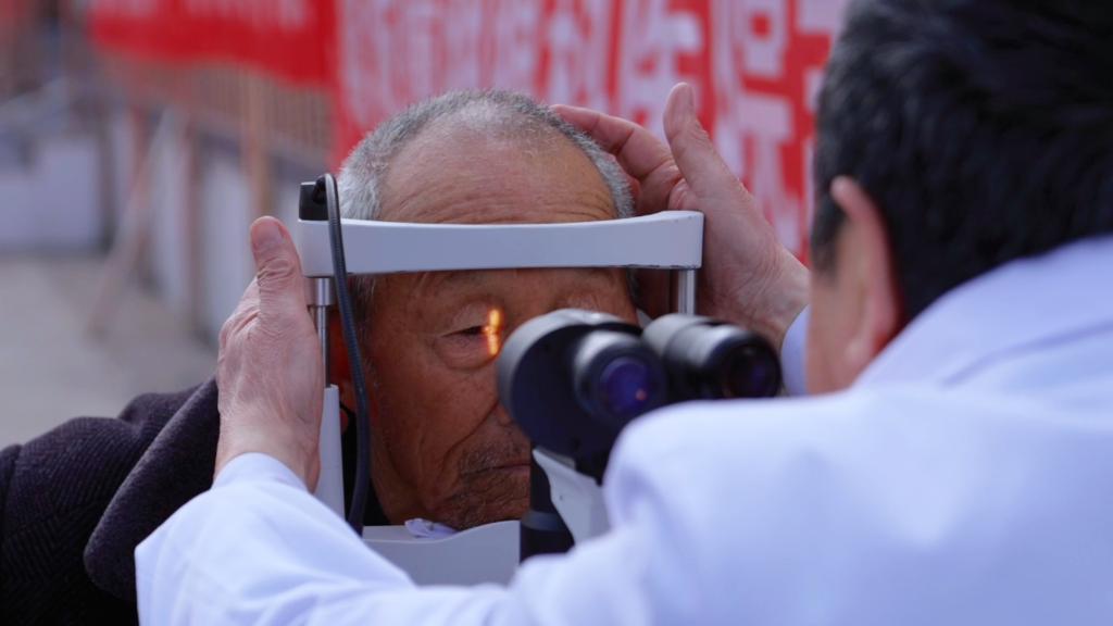 ボランティア活動に参加し高齢者の視力を検査する医師。(3月12日撮影、許昌=新華社配信/王永濤)