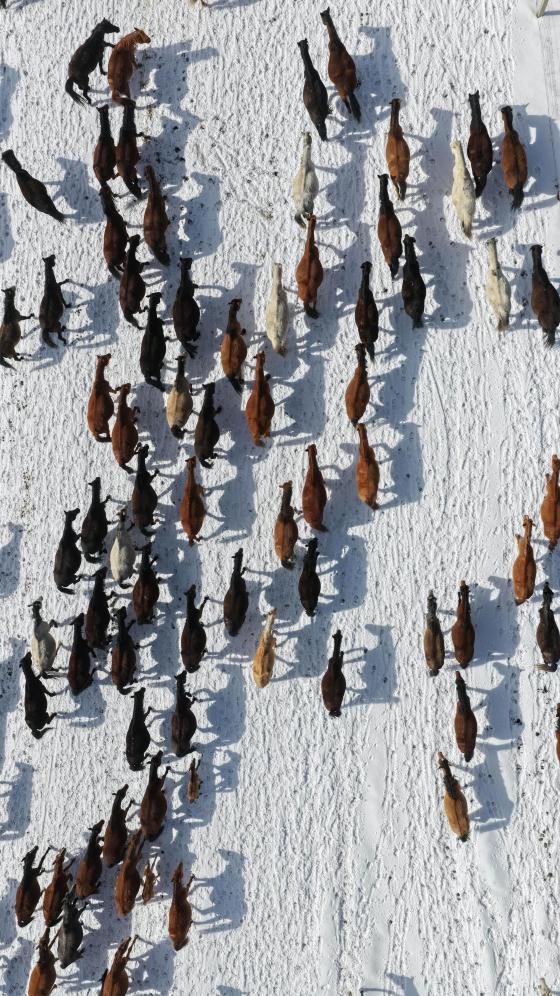 14日、山丹馬場を移動する馬の群れ。(ドローンから、張掖=新華社配信/王超)