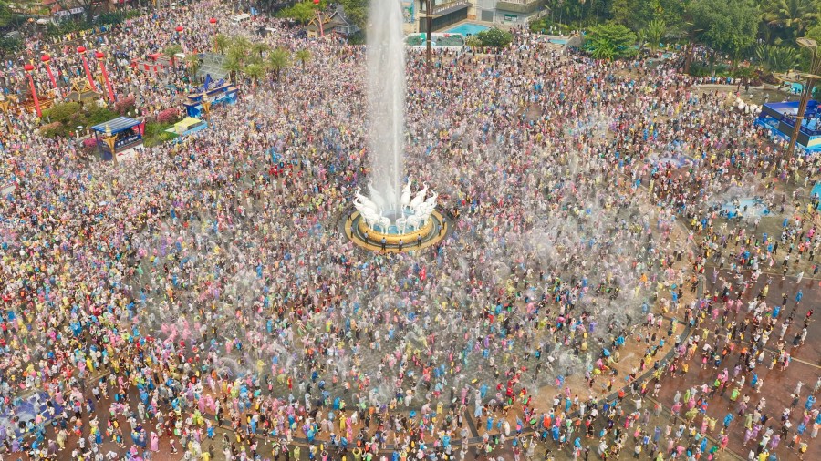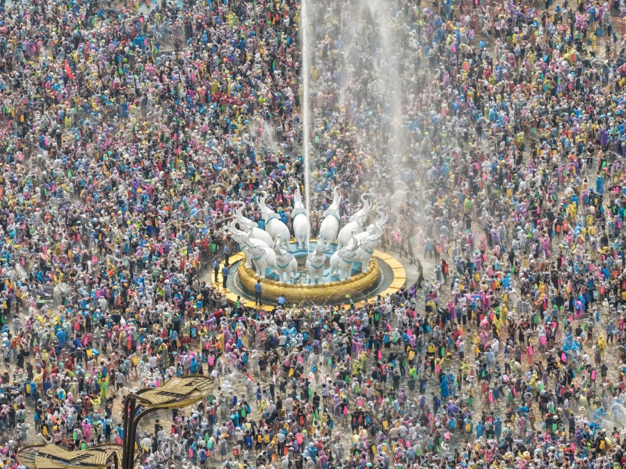 15日、会場の広場で水かけ祭りを楽しむ人々。(ドローンから、景洪=新華社配信)