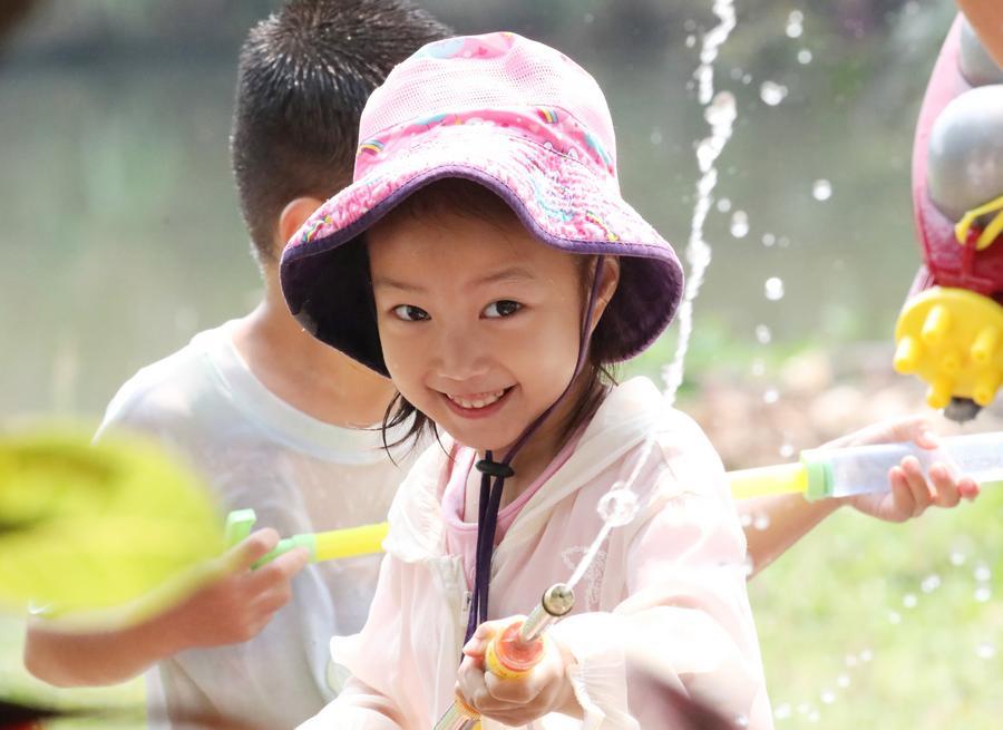 15日、会場の広場で水かけ祭りを楽しむ子ども。(景洪=新華社記者/江文耀)