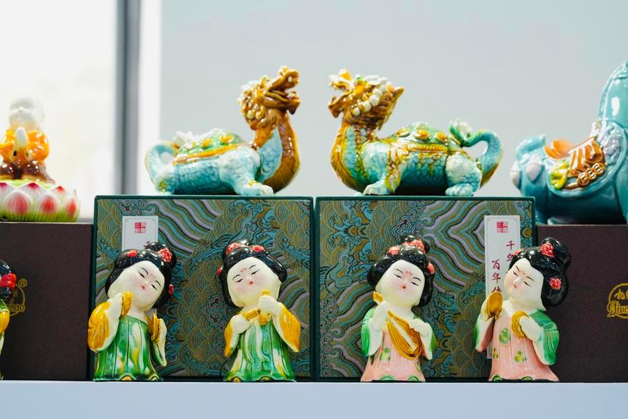 15日、河南省ブースに展示された唐三彩の工芸品。(海口=新華社記者/許芸潁)