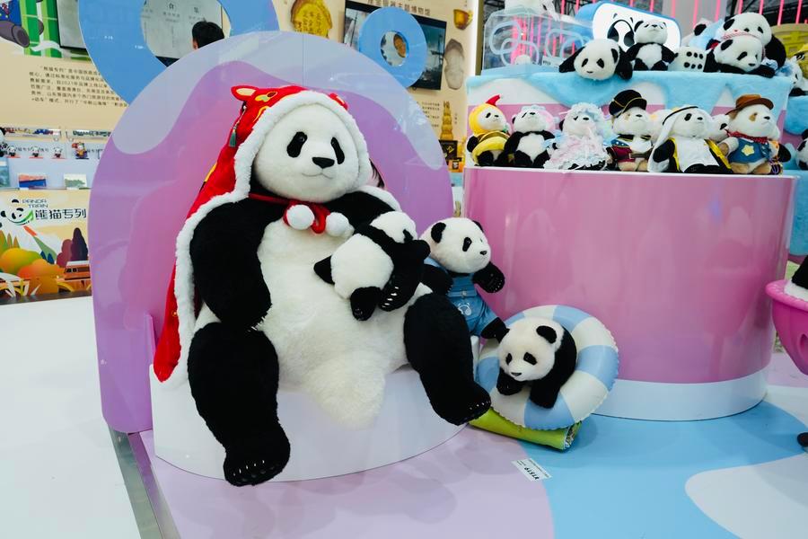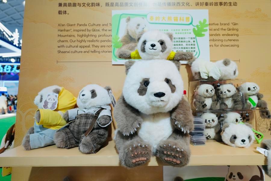 15日、陝西省ブースに展示されたパンダのぬいぐるみ。(海口=新華社記者/許芸潁)