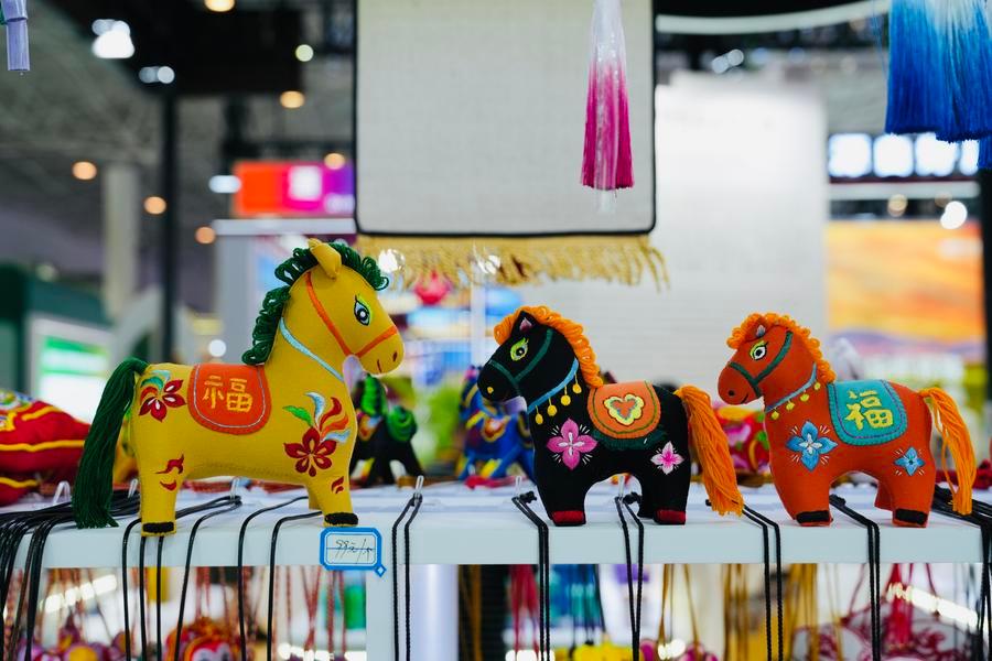 15日、甘粛省ブースに展示された手工芸品。(海口=新華社記者/許芸潁)