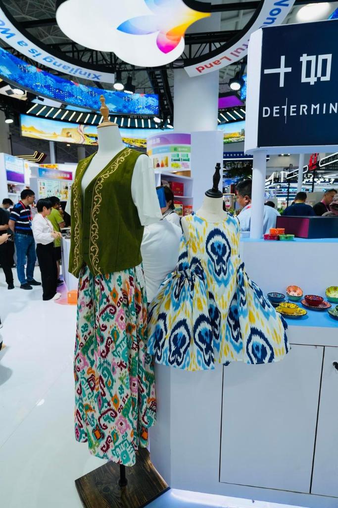 15日、新疆ウイグル自治区ブースに展示されたアパレル。(海口=新華社記者/許芸潁)