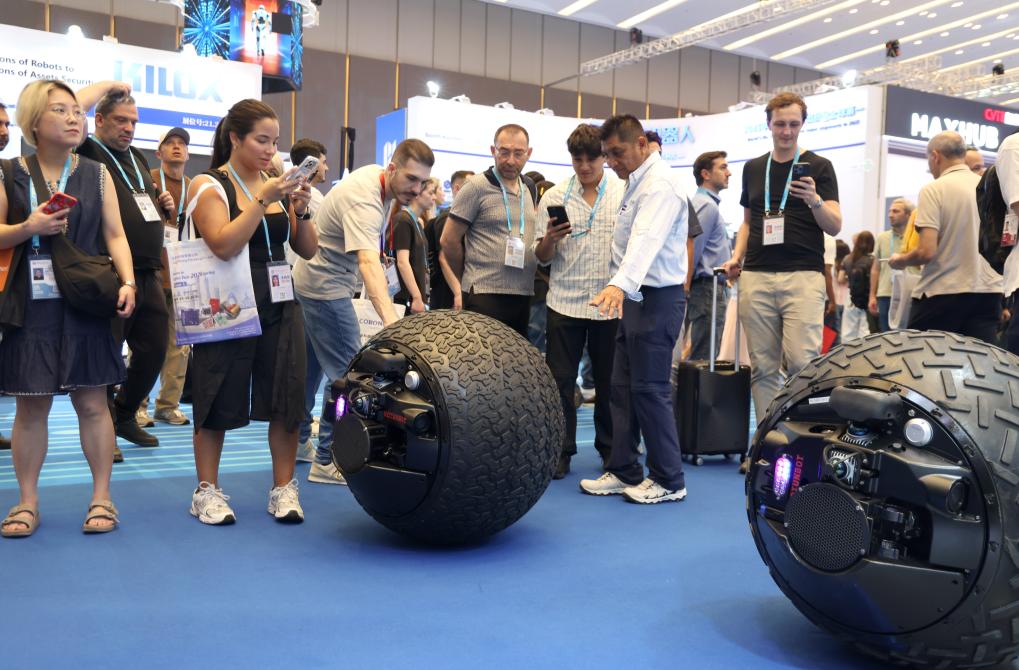 15日、広州交易会で警備ロボットを見学する海外バイヤー。(広州=新華社記者/盧漢欣)