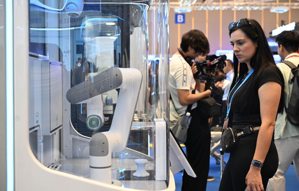 15日、広州交易会でコーヒーロボットを体験する海外バイヤー。(広州=新華社記者/盧漢欣)