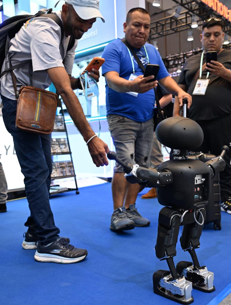 15日、広州交易会で卓上人型ロボットと交流する海外バイヤー。(広州=新華社記者/鄧華)