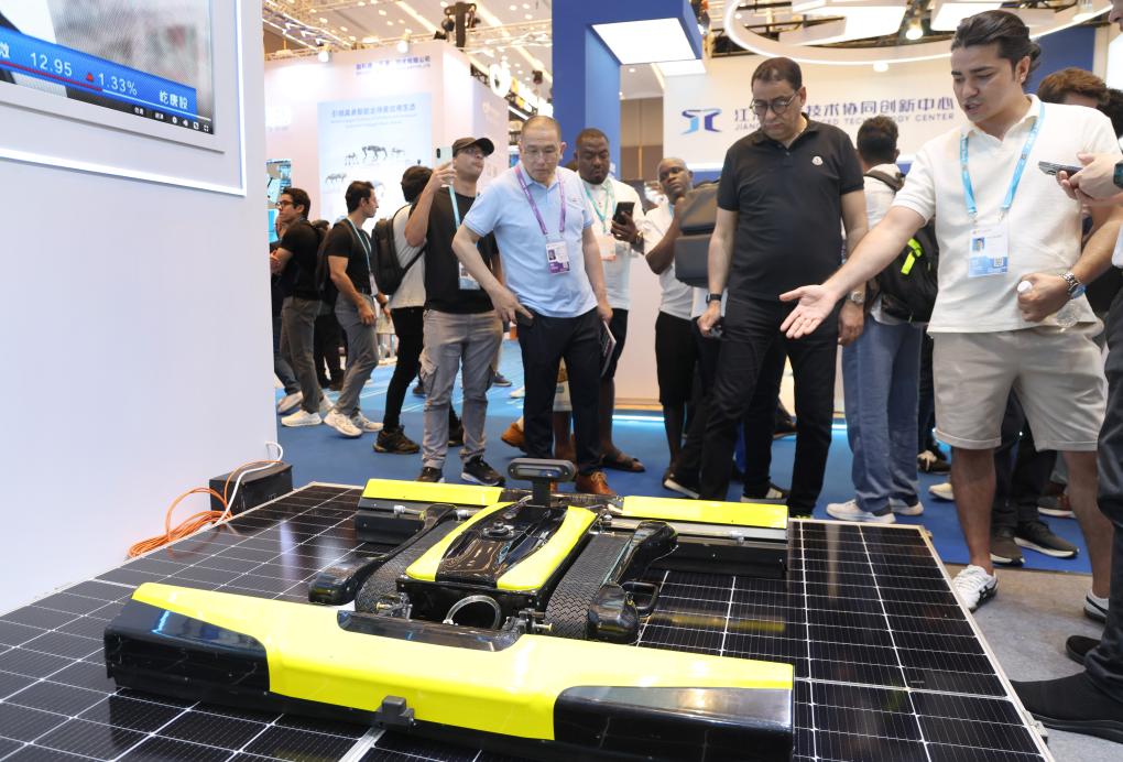 15日、広州交易会で太陽光パネルの清掃ロボットの説明を受ける海外バイヤー。(広州=新華社記者/盧漢欣)