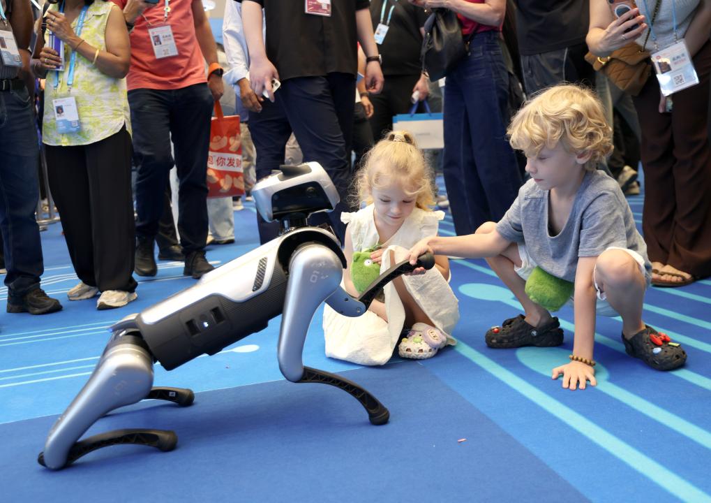 15日、広州交易会でロボット犬と握手する子ども。(広州=新華社記者/盧漢欣)