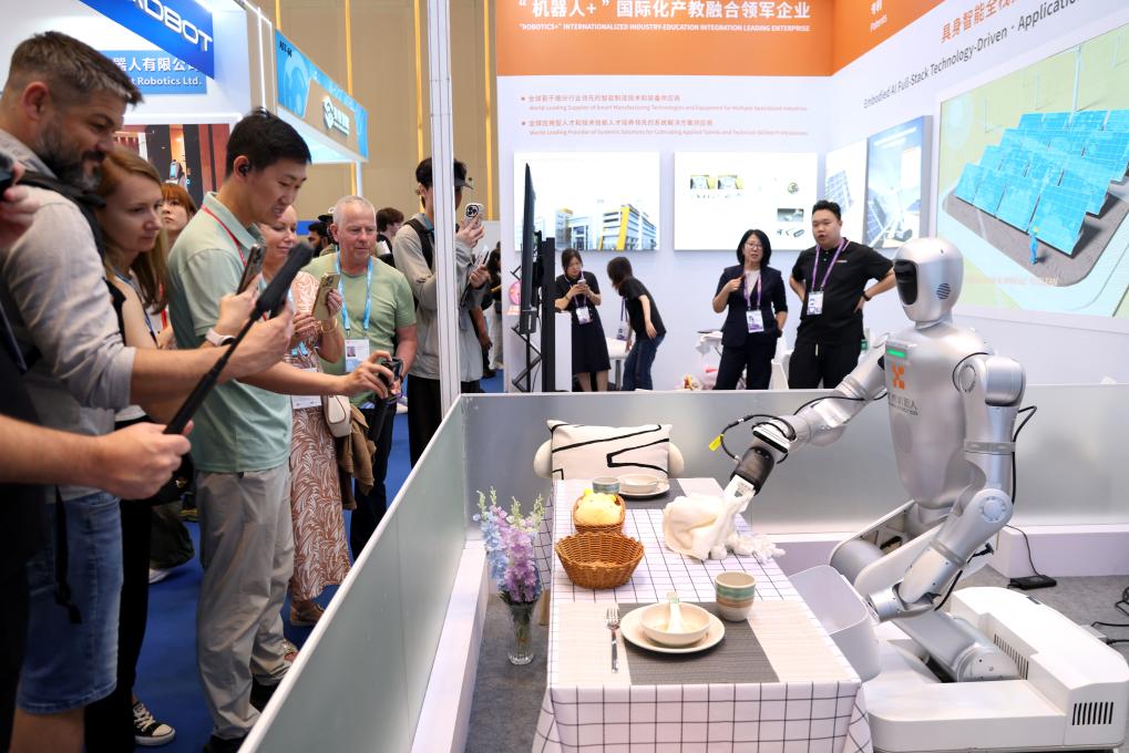 15日、広州交易会でテーブルを片付けるロボットの実演を見学する海外バイヤー。(広州=新華社記者/盧漢欣)