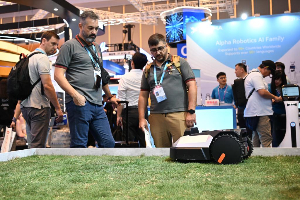 15日、広州交易会で除草ロボットを見学する海外バイヤー。(広州=新華社記者/鄧華)
