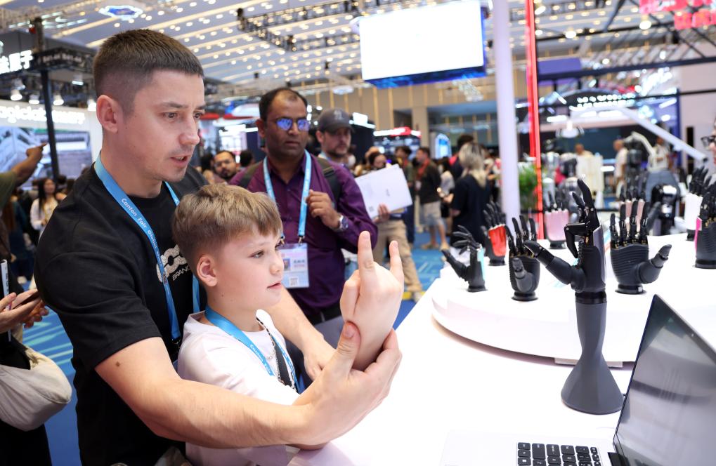 15日、広州交易会でロボットハンドと交流する子ども連れの海外バイヤー。(広州=新華社記者/盧漢欣)