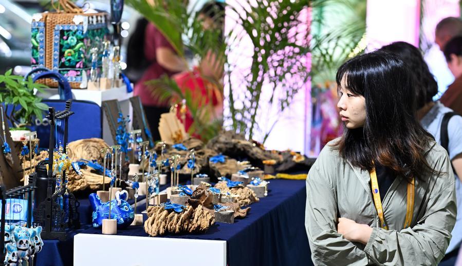 18日、消費品博で展示品を見る人たち。(海口=新華社記者/楊冠宇)