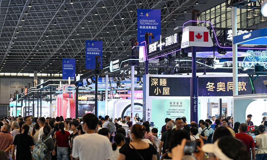 18日、来場者でにぎわう消費品博のテクノロジー消費エリア。(海口=新華社記者/楊冠宇)