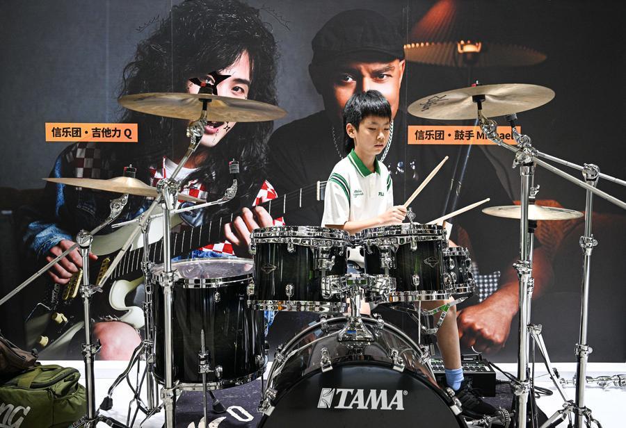 18日、消費品博で楽器を試奏する人。(海口=新華社記者/蒲暁旭)