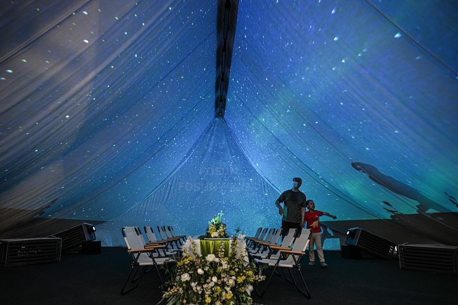 18日、消費品博で没入型リゾート空間を体験する人。(海口=新華社記者/蒲暁旭)