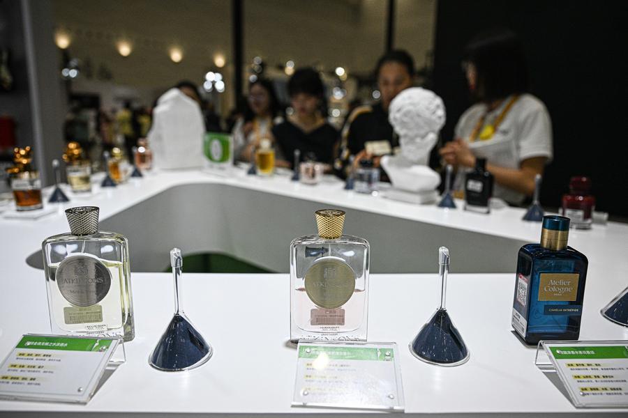 18日、消費品博で展示された香水。(海口=新華社記者/蒲暁旭)