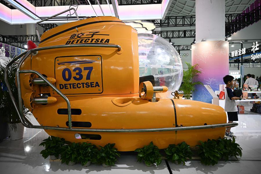 18日、消費品博の重慶ブースに展示された地元企業、坤聯機械製造の有人潜水艇「鮫子」号。(海口=新華社記者/蒲暁旭)