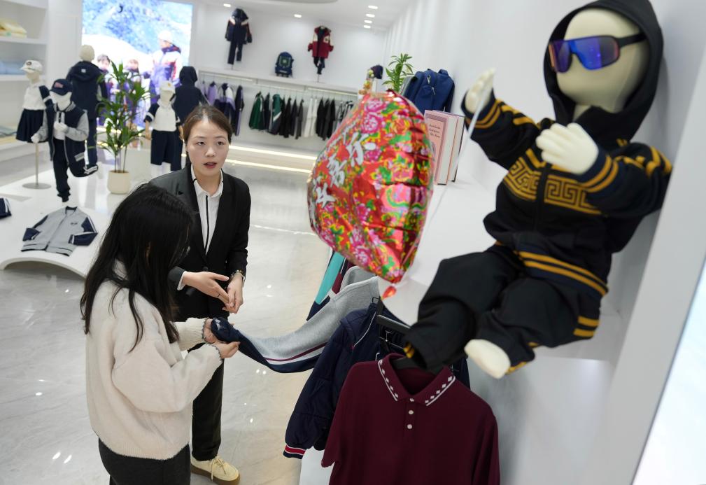 13日、織里鎮にある子ども服メーカーのショールームで、顧客に製品を紹介する従業員。(湖州=新華社記者/韓伝号)