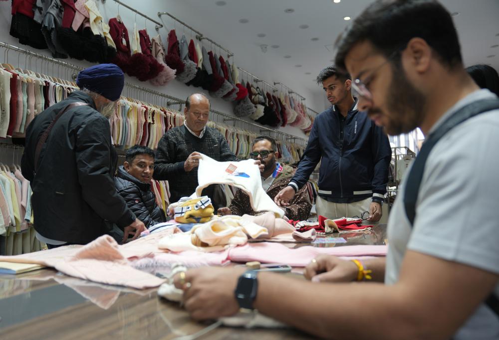 13日、子ども服専門市場「中国織里童装城」の店舗で商品を買い付けるインドのバイヤー。(湖州=新華社記者/韓伝号)