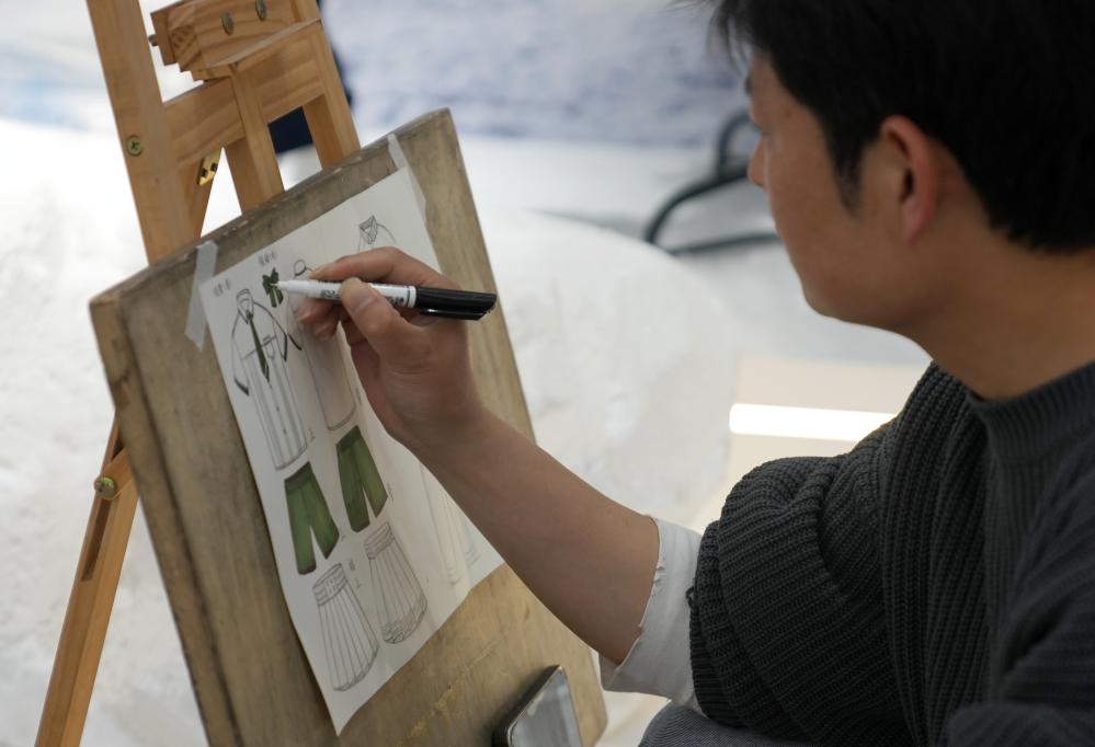 13日、織里鎮の子ども服メーカーで学校制服のデザイン画を描くデザイナー。(湖州=新華社記者/韓伝号)