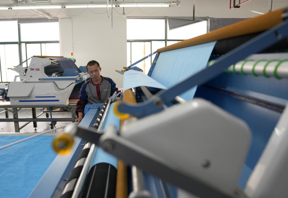 13日、織里鎮にある子ども服メーカーのスマート工場で、裁断ラインを操作する従業員。(湖州=新華社記者/韓伝号)
