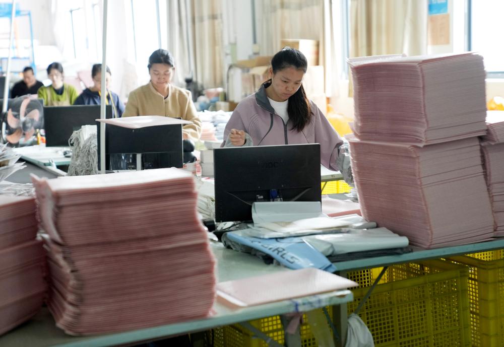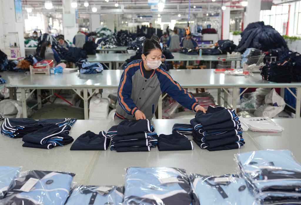 13日、織里鎮にある子ども服メーカーの工場で、梱包前の学校制服を整理する従業員。2025年、同鎮の学校制服・園児服売上高は120億元に上った。(湖州=新華社記者/韓伝号)