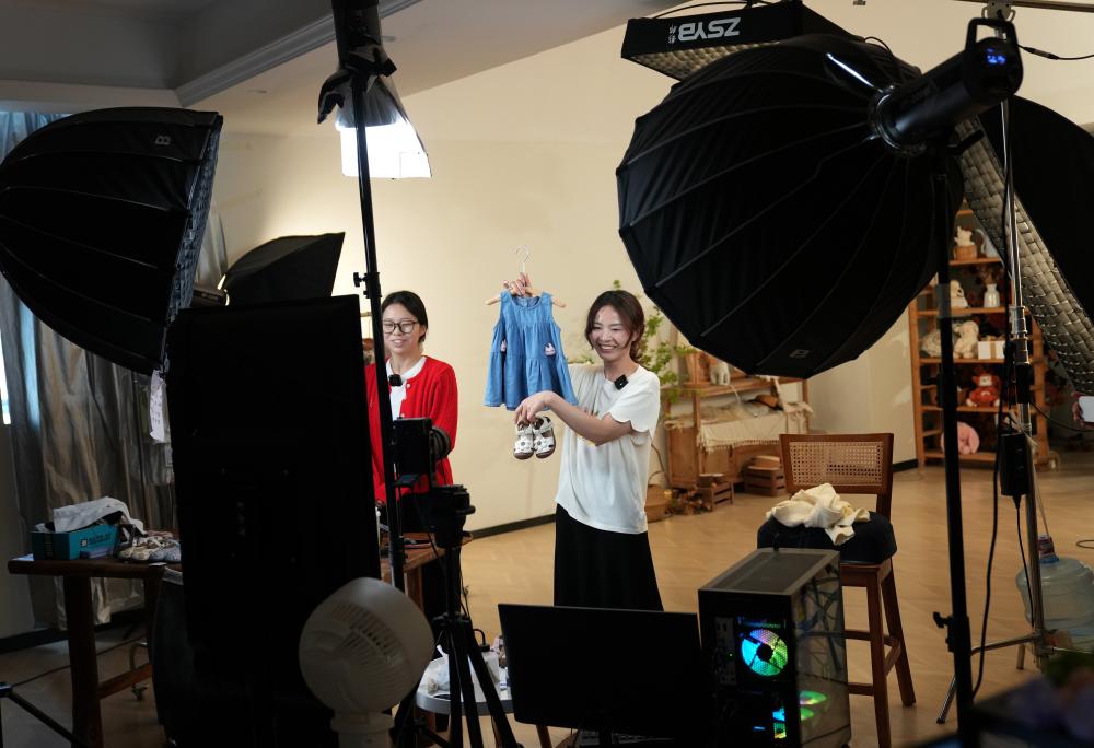 13日、織里鎮にある子ども服メーカーで製品をPRする配信者。(湖州=新華社記者/韓伝号)