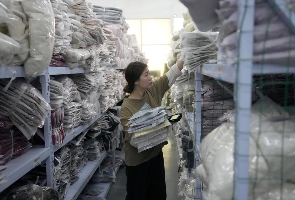 13日、織里鎮にある子ども服メーカーの倉庫でピッキング作業をする従業員。(湖州=新華社記者/韓伝号)