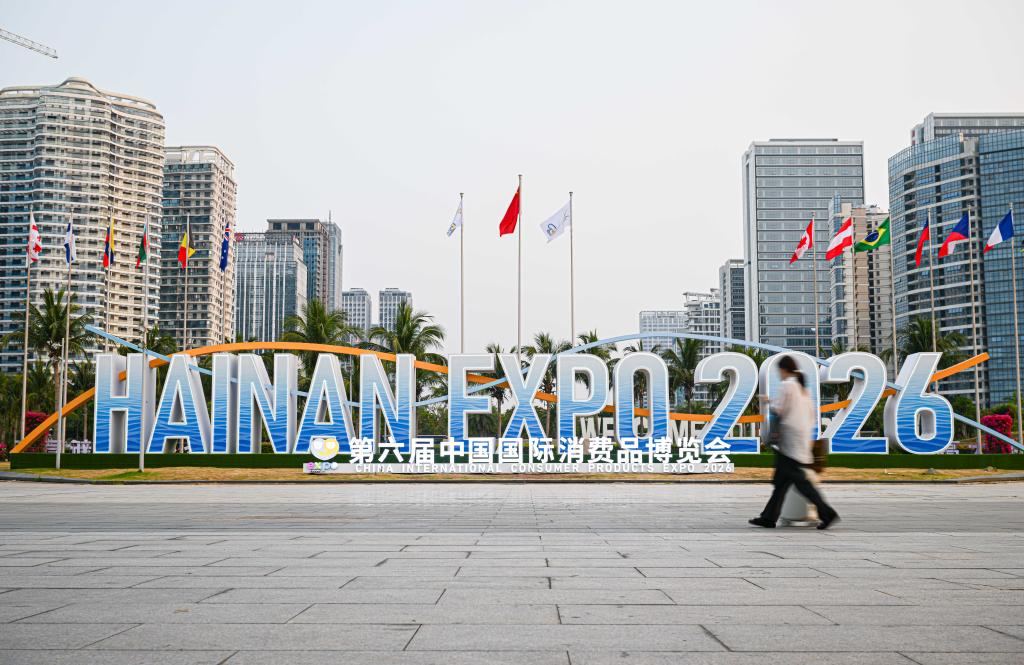 11日、第6回消費品博の会場に設置された大型ロゴ。(海口=新華社記者/蒲暁旭)