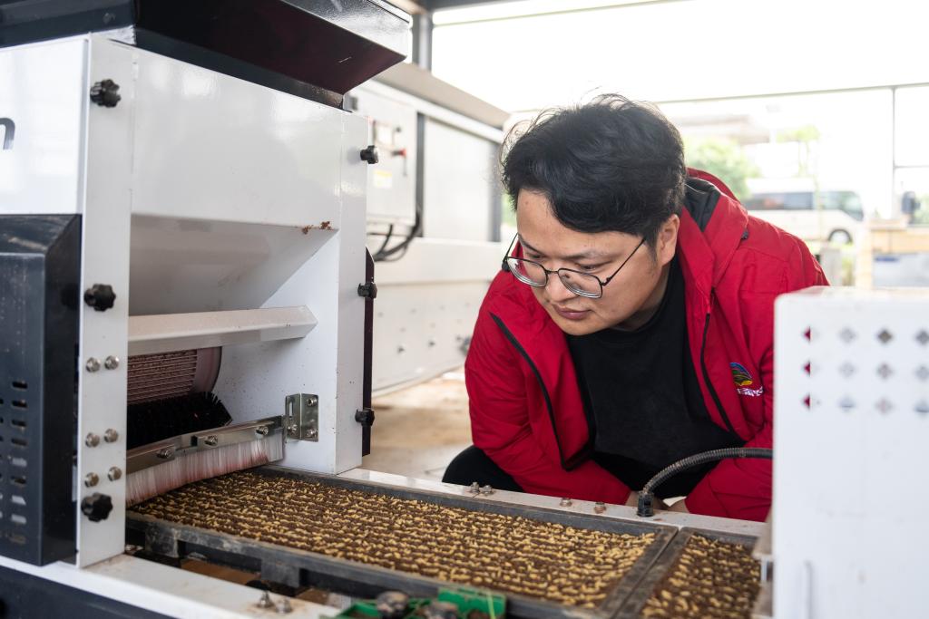 17日、高塘嶺街道湘江村スマート農場の育苗生産ラインで、播種の均一性を確認する従業員。(長沙=新華社記者/陳思汗)