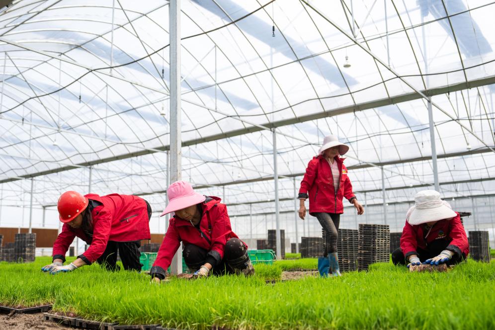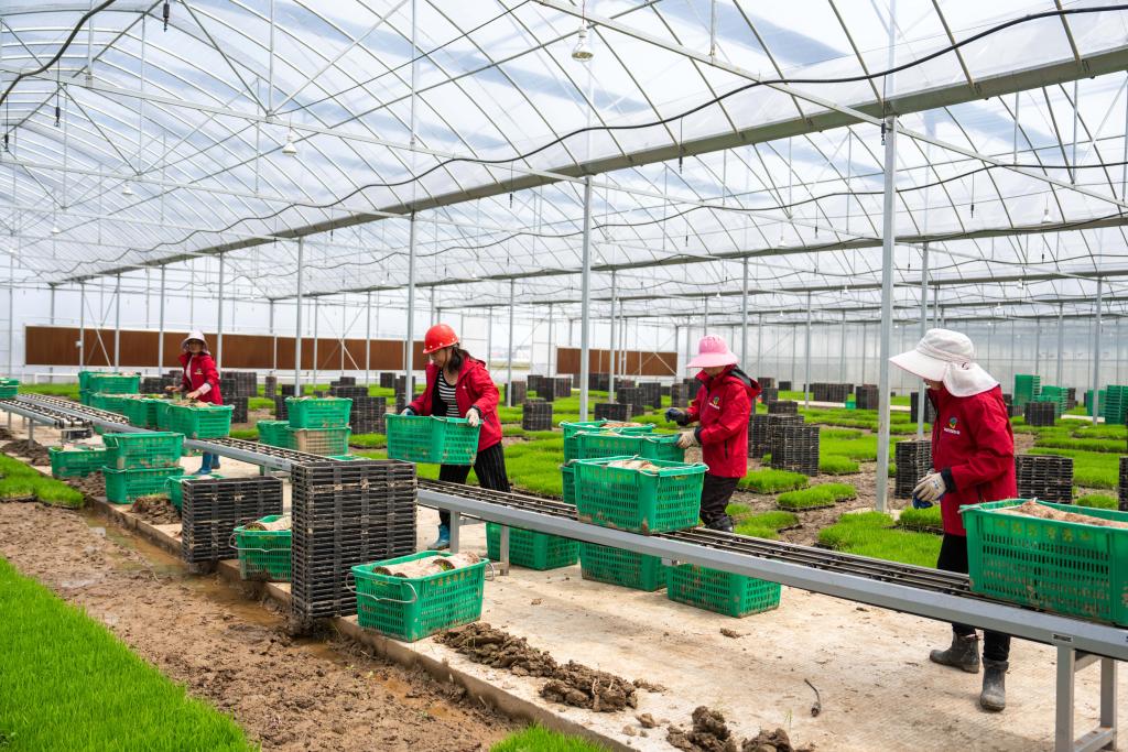 17日、高塘嶺街道湘江村にあるスマート農場の温室で、苗を並べる従業員。(長沙=新華社記者/陳思汗)