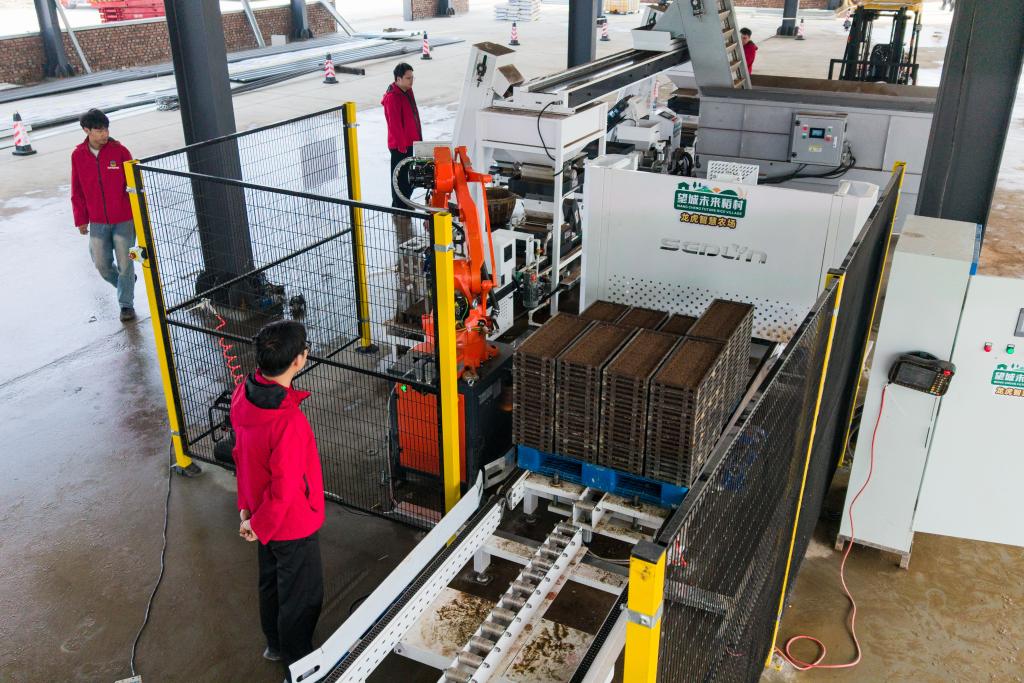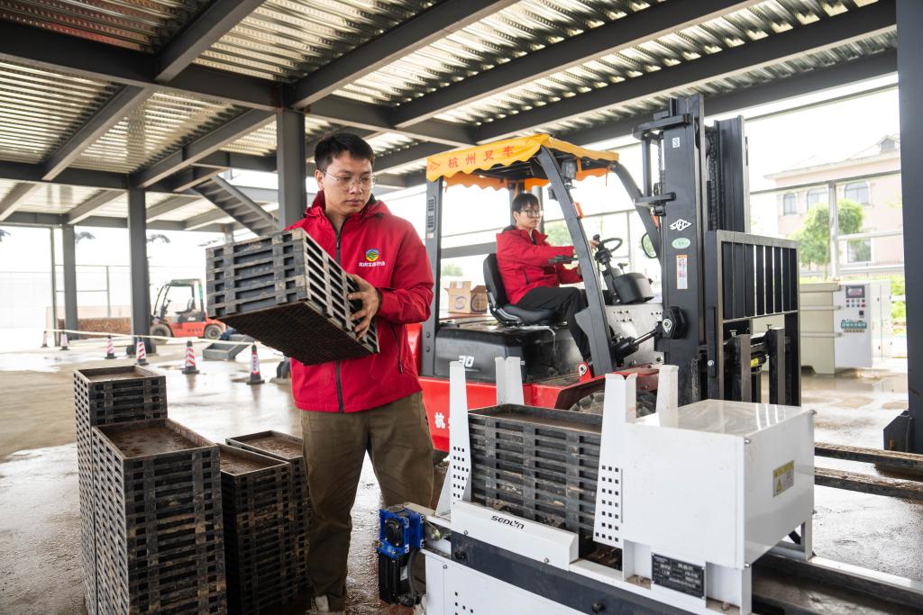 17日、高塘嶺街道湘江村スマート農場の育苗生産ラインで育苗パレットを並べる従業員。(長沙=新華社記者/陳思汗)