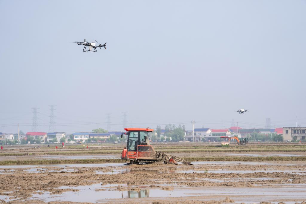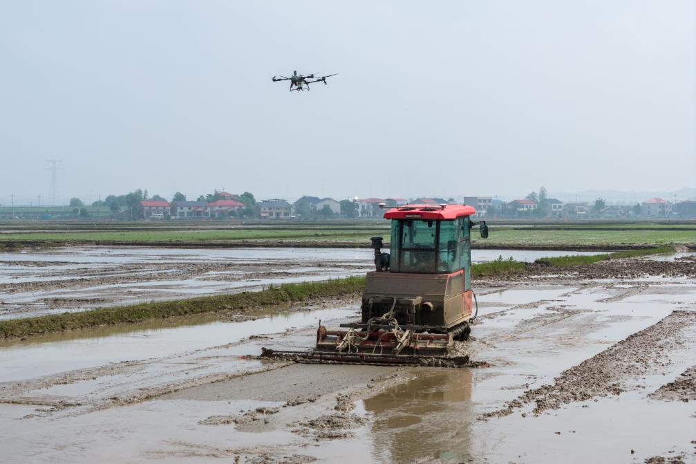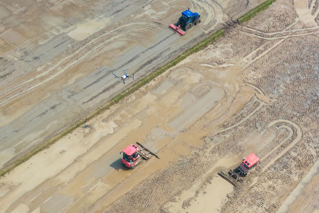 17日、高塘嶺街道湘江村スマート農場で、自動運転耕運機と農業用ドローンの連携で行われる田起こしと施肥作業の様子。(長沙=新華社記者/陳思汗)
