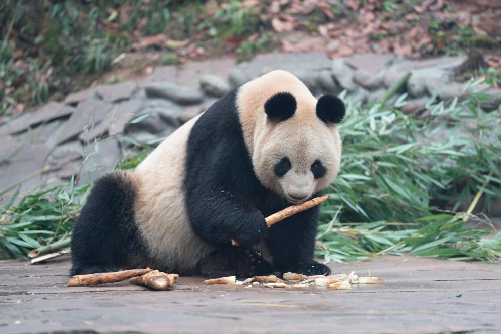 タケノコのにおいを嗅ぐシンシン。(2月4日撮影、雅安=新華社配信/Panda365提供)