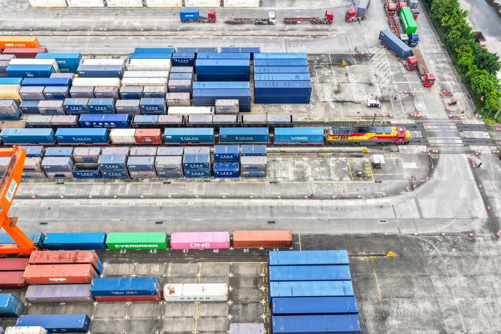15日、重慶製新エネ車を満載し、団結村中心駅で出発を待つ「中老鉄道」の国際貨物列車。(ドローンから、重慶=新華社記者/唐奕)
